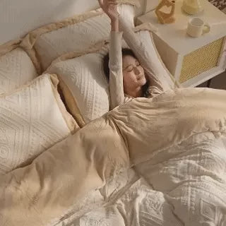 Experimente el máximo lujo con el juego de sábanas de terciopelo Jacquard Light Luxury de doble cara, diseñado para quienes valoran tanto el estilo como la comodidad. Este juego de cama presenta un diseño único de dos colores AB, que ofrece una estética sofisticada con un toque de versatilidad.